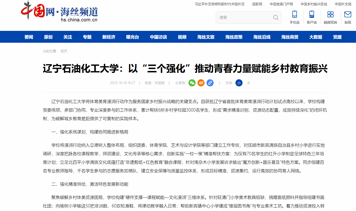 編者按:近日,中國網、中國經濟新聞網、中國日報網對我校團委張國慶撰寫的文章《遼寧石油化工大學:以“三個強化”推動青春力量賦能鄉村教育振興》進行了宣傳報道。現將相關報道轉載如下: