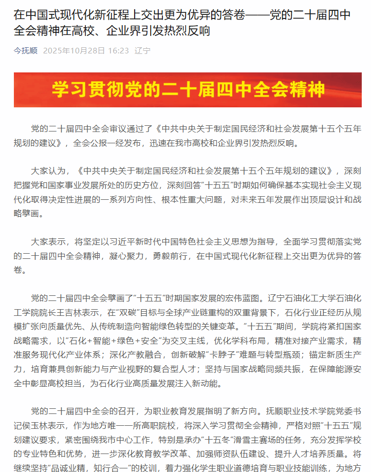 編者按:黨的二十屆四中全會審議通過了《中共中央關于制定國民經濟和社會發展第十五個五年規劃的建議》,全會公報一經發布,迅速在我市高校和企業界引發熱烈反響。10月28日,今撫順微信公眾號刊發《在中國式現代化新征程上交出更為優異的答卷——黨的二十屆四中全會精神在高校、企業界引發熱烈反響》,其中對我校石油化工學院院長王吉林的感言作了組稿宣傳?,F將相關報道轉載如下:
