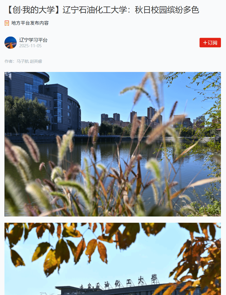 編者按:11月5日,學習強國遼寧學習平臺對我校新媒體中心學生馬子航、趙英睿拍攝的學校秋季繽紛景色以圖集形式作了宣傳報道?,F將相關報道轉載如下: