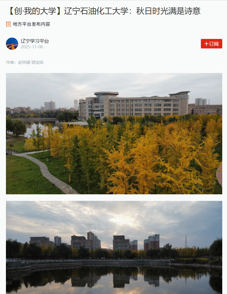 編者按:11月6日,學習強國遼寧學習平臺對我校新媒體中心學生趙英睿、郭金銘拍攝的學校秋季景色以圖集形式作了宣傳報道?,F將相關報道轉載如下: