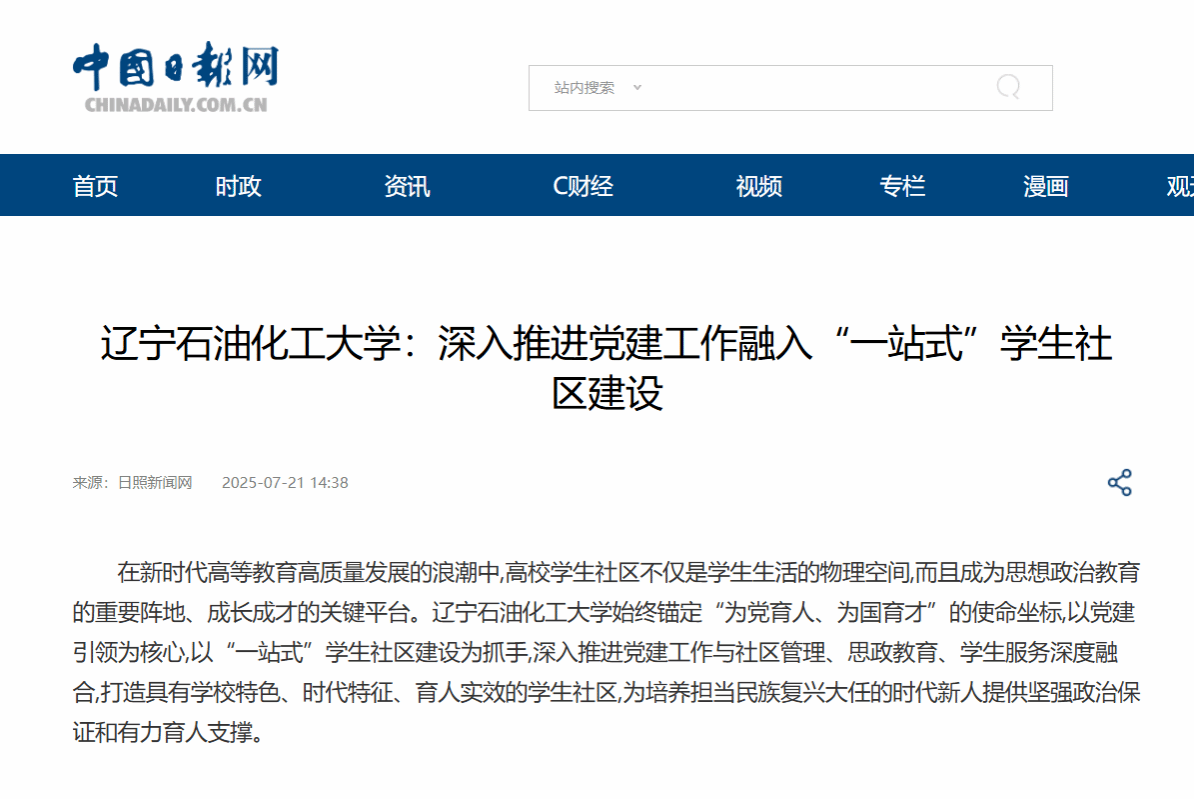 編者按:近日,中國日報網、中國工業新聞網(中國工業報官網)、中國網、中華網等媒體平臺對我校付曉倩老師撰寫的理論文章《遼寧石油化工大學:深入推進黨建工作融入“一站式”學生社區建設》進行了轉載報道?,F將相關報道轉載如下: