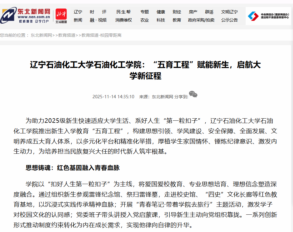 編者按:為助力2025級新生快速適應大學生活、系好人生“第一粒扣子”,遼寧石油化工大學石油化工學院推出新生入學教育“五育工程”,構建思想引領、學風建設、安全保障、全面發展、文明養成五大育人體系,以多元化平臺和精準化舉措,厚植學生家國情懷,錘煉紀律意識,激發成長內生動力。11月14日,東北新聞網對此工作進行了報道,現將相關報道轉載如下: