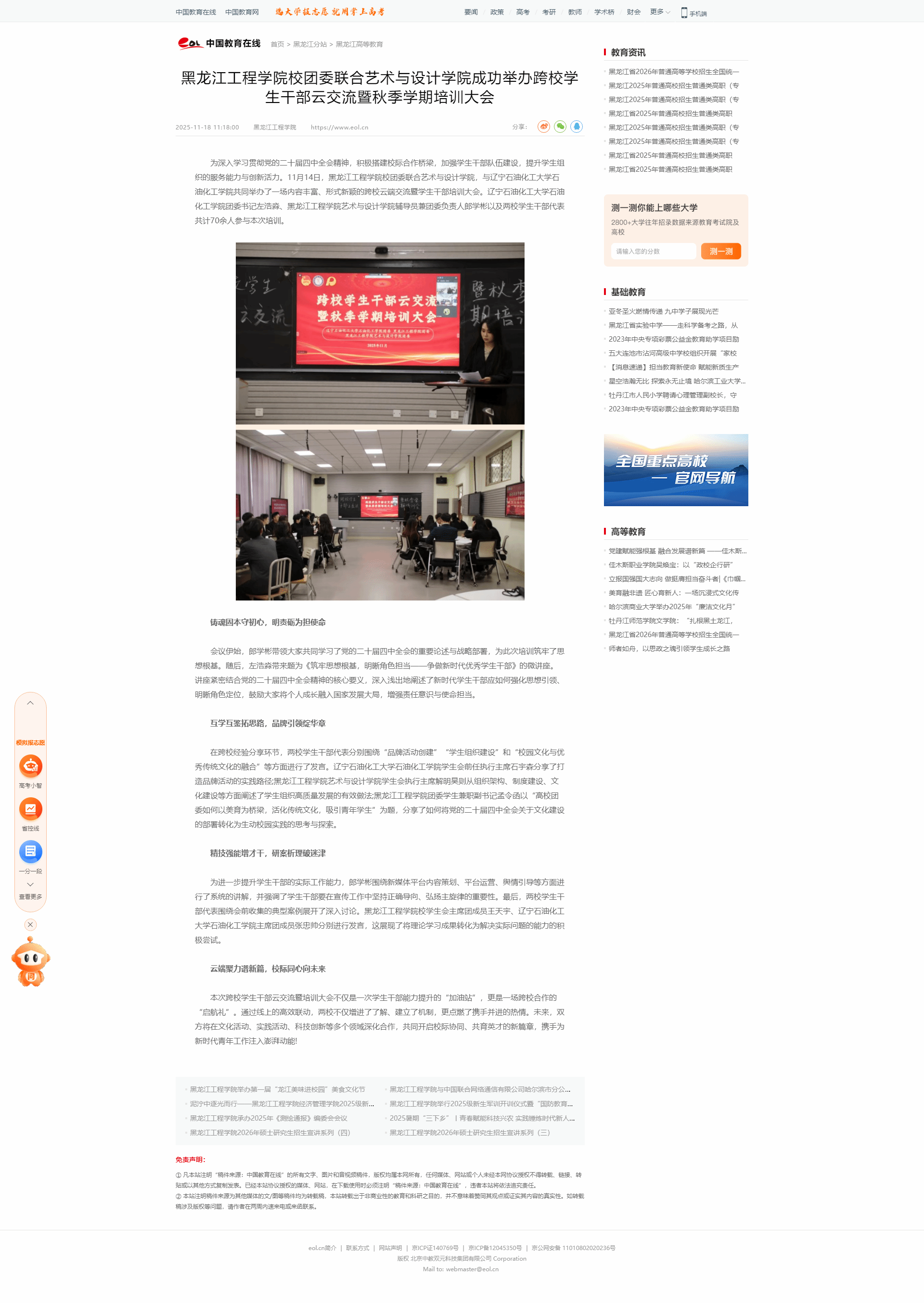 編者按:為積極搭建校際合作橋梁,加強學生干部隊伍建設,提升學生組織的服務能力與創新活力。11月14日,黑龍江工程學院團委聯合藝術與設計學院,與遼寧石油化工大學石油化工學院共同舉辦了一場內容豐富、形式新穎的跨校云端交流暨學生干部培訓大會。遼寧石油化工大學石油化工學院團委書記左浩淼、黑龍江工程學院藝術與設計學院輔導員兼團委負責人郎學彬以及兩校學生干部代表共計70余人參與培訓。11月18日,中國教育在線、黑龍江網進行了報道,現將相關報道轉載如下: