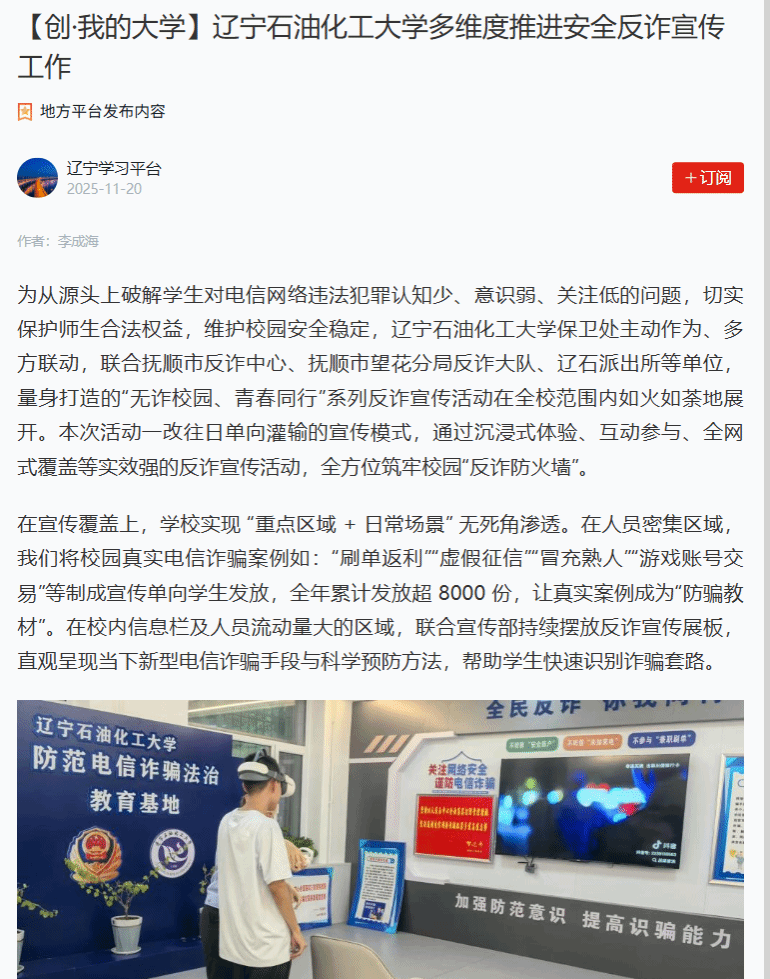 編者按:為從源頭上破解學生對電信網絡違法犯罪認知少、意識弱、關注低的問題,切實保護師生合法權益,維護校園安全穩定,遼寧石油化工大學保衛處主動作為、多方聯動,聯合撫順市反詐中心、撫順市望花分局反詐大隊、遼石派出所等單位,量身打造的“無詐校園、青春同行”系列反詐宣傳活動在全校范圍內如火如荼地展開。本次活動一改往日單向灌輸的宣傳模式,通過沉浸式體驗、互動參與、全網式覆蓋等實效強的反詐宣傳活動,全方位筑牢校園“反詐防火墻”。學習強國遼寧學習平臺、人民日報客戶端·人民號、遼寧日報·遼望號、中國大學生網、搜狐號等媒體關注報道,引發廣泛反響?,F將相關報道轉載如下: