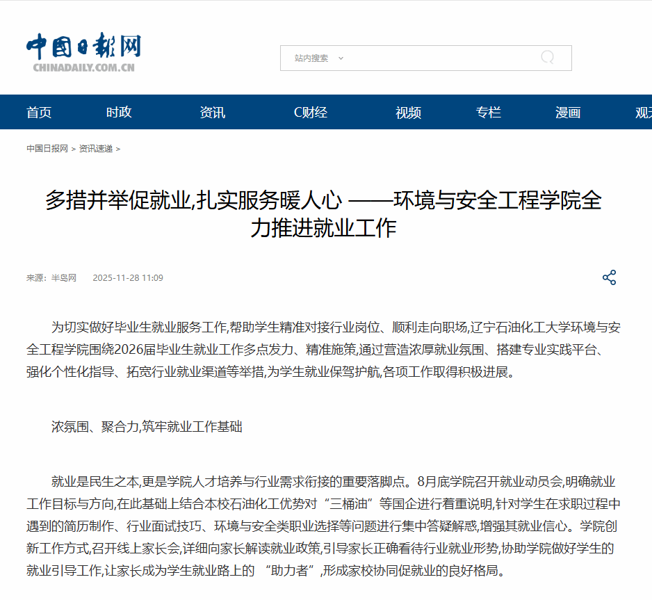 編者按:為切實做好畢業生就業服務工作,幫助學生精準對接行業崗位、順利走向職場,遼寧石油化工大學環境與安全工程學院圍繞2026屆畢業生就業工作多點發力、精準施策,通過營造濃厚就業氛圍、搭建專業實踐平臺、強化個性化指導、拓寬行業就業渠道等舉措,為學生就業保駕護航,各項工作取得積極進展。中國日報網進行報道。現將相關報道轉載如下: