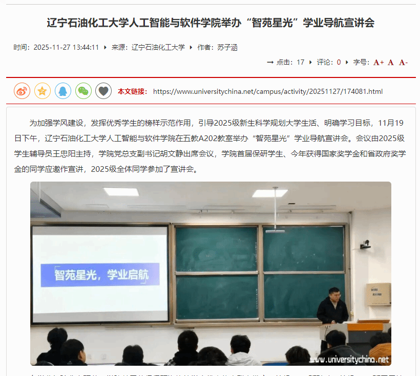 編者按:11月19日,遼寧石油化工大學人工智能與軟件學院以“榜樣領航育學風”為核心,在五教A202教室舉辦“智苑星光”學業導航宣講會?;顒哟罱烁叩湍昙壗涣骰ヨb平臺,助力學風建設深化與新生成長規劃落地,中國大學生網對此進行了宣傳報道,現將相關報道轉載如下: