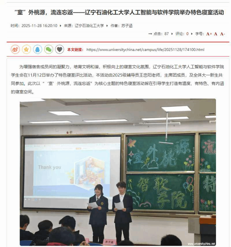 編者按:11月12日,遼寧石油化工大學人工智能與軟件學院以“‘室’外桃源,流連忘返”為核心,舉辦特色寢室評比活動?;顒幽鬯奚岢蓡T向心力,培育文明向上的寢室文化,搭建寢室風采展示與交流平臺。中國大學生網對此進行了宣傳報道,現將相關報道轉載如下: