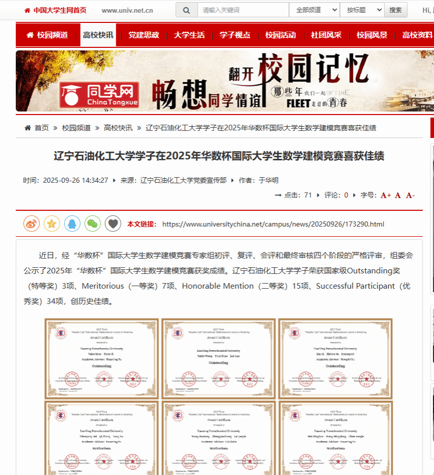 編者按:近日,經“華數杯”國際大學生數學建模競賽專家組初評、復評、會評和最終審核四個階段的嚴格評審,組委會公示了2025年“華數杯”國際大學生數學建模競賽獲獎成績。遼寧石油化工大學學子榮獲國家級Outstanding獎(特等獎)3項、Meritorious(一等獎)7項、HonorableMention(二等獎)15項、SuccessfulParticipant(優秀獎)34項,創歷史佳績。中國大學生網、遼寧日報·遼望號、搜狐網對此進行了宣傳報道?,F將相關報道轉載如下: