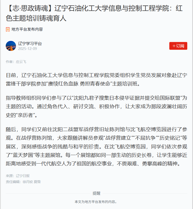 編者按:近日,遼寧石油化工大學信息與控制工程學院黨委組織學生黨員發展對象赴遼寧雷鋒干部學院參加“賡續紅色血脈 勇擔青春使命”主題培訓班。學習強國遼寧學習平臺對此進行了宣傳報道?,F將相關報道轉載如下: