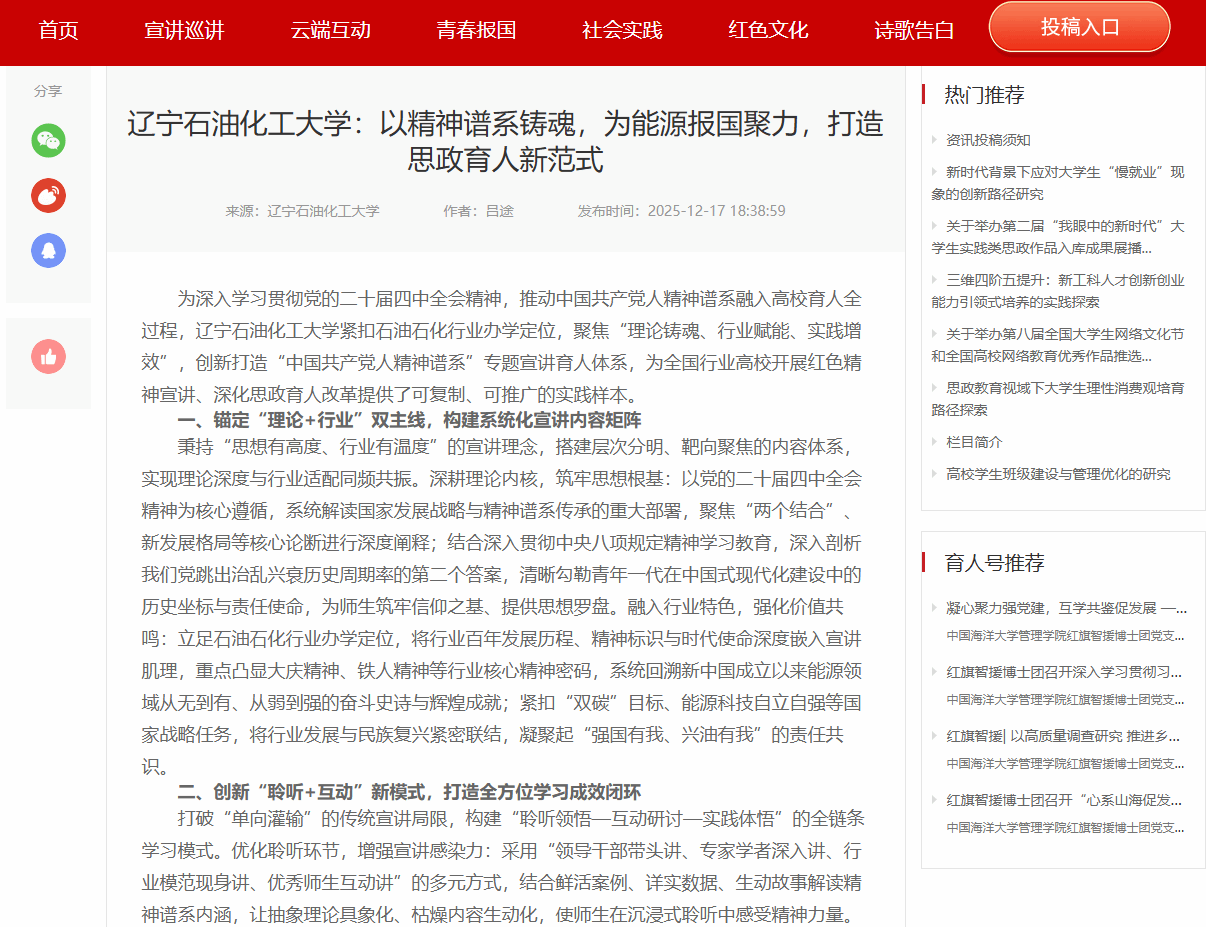 編者按:為深入學習貫徹黨的二十屆四中全會精神,推動中國共產黨人精神譜系融入高校育人全過程,遼寧石油化工大學緊扣石油石化行業辦學定位,聚焦“理論鑄魂、行業賦能、實踐增效”,創新打造“中國共產黨人精神譜系”專題宣講育人體系,為全國行業高校開展紅色精神宣講、深化思政育人改革提供了可復制、可推廣的實踐樣本。全國高校思想政治工作網以"遼寧石油化工大學:以精神譜系鑄魂,為能源報國聚力,打造思政育人新范式"為題,對此進行了宣傳報道。現將相關報道轉載如下: