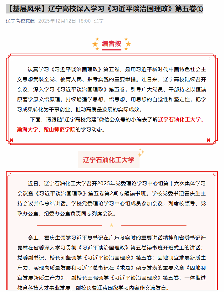 編者按:認真學習《習近平談治國理政》第五卷,是用習近平新時代中國特色社會主義思想武裝全黨、教育人民、指導實踐的重要舉措。連日來,遼寧高校陸續召開會議,深入學習《習近平談治國理政》第五卷,引導廣大黨員、干部持之以恒讀原著學原文悟原理,持續增強學思想、悟思想、用思想的自覺性和堅定性,把學習成果轉化為干事創業、推動高質量發展的實際成效。12月12日,遼寧高校黨建微信公眾號對我校的學習動態進行了組稿宣傳。現將相關報道轉載如下: