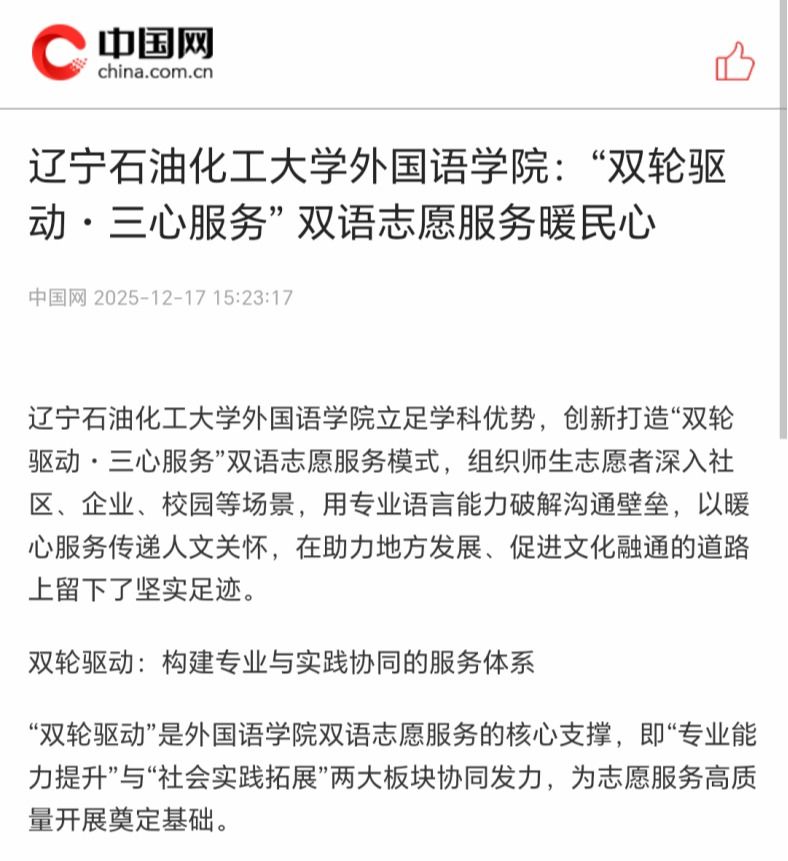 編者按:遼寧石油化工大學外國語學院立足學科優勢,創新打造“雙輪驅動?三心服務”雙語志愿服務模式,用專業語言能力破解溝通壁壘,以暖心服務傳遞人文關懷。中國網、中國日報網、改革網對其內容進行了宣傳報道,現將相關報道轉載如下: