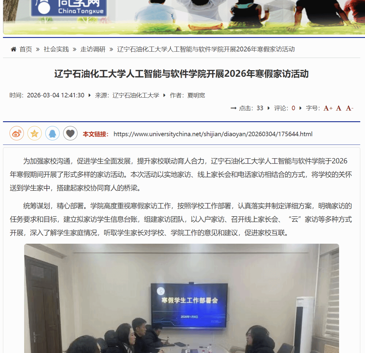 編者按:2026年寒假,遼寧石油化工大學人工智能與軟件學院開展“家校攜手同心筑夢”主題家訪活動,以精準關愛學生為核心,創(chuàng)新線上線下結(jié)合的家訪模式,搭建家校協(xié)同育人堅實橋梁,助力學生成長成才。中國大學生網(wǎng)對此進行了宣傳報道,現(xiàn)將相關報道轉(zhuǎn)載如下: