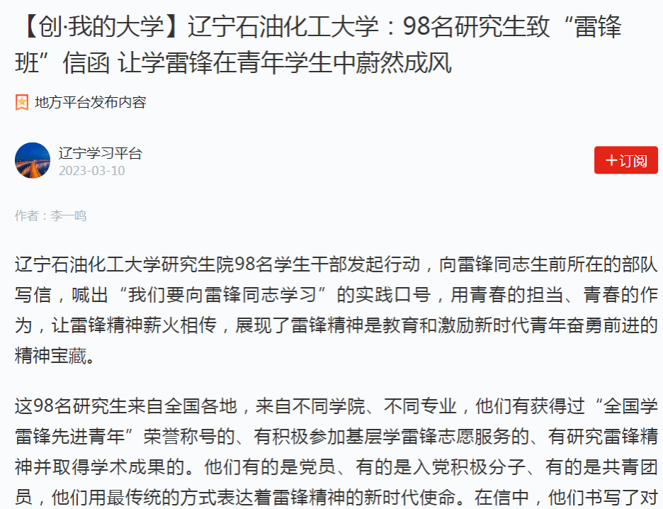 編者按:近日,學習強國遼寧學習平臺、遼寧日報·北國號、人民日報客戶端·人民號等媒體平臺對我校研究生院98名學生干部發起行動,向雷鋒同志生前所在的部隊寫信,喊出“我們要向雷鋒同志學習”的實踐口號,用青春的擔當、青春的作為,讓雷鋒精神薪火相傳,展現了雷鋒精神是教育和激勵新時代青年奮勇前進的精神寶藏進行了宣傳報道。現將相關報道轉載如下: