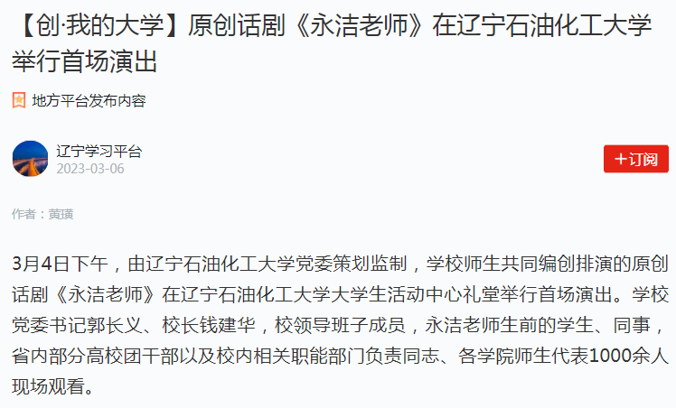 編者按:近日,全國高校思想政治工作工作網、學習強國遼寧學習平臺、中央廣電總臺國際在線、北斗融媒、遼寧日報·北國號、人民日報客戶端·人民號等媒體平臺對我校師生共同編創排演的原創話劇《永潔老師》,于3月4日下午在大學生活動中心禮堂舉行首場演出進行了宣傳報道?,F將相關報道轉載如下: