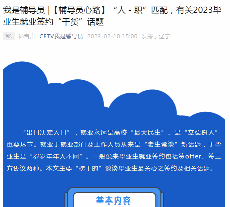 編者按:近日,中國教育電視臺“CETV我是輔導員微信公眾號”對我校楊青舟老師撰寫的文章《“人-職”匹配,有關2023畢業生就業簽約“干貨”話題》進行了宣傳報道?,F將相關報道轉載如下: