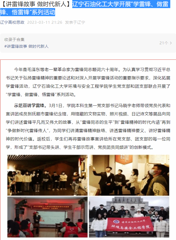 編者按:近日,遼寧高校思政微信公眾號對我校環境與安全工程學院開展“學雷鋒、做雷鋒、悟雷鋒”系列活動進行了宣傳報道?,F將相關報道轉載如下: