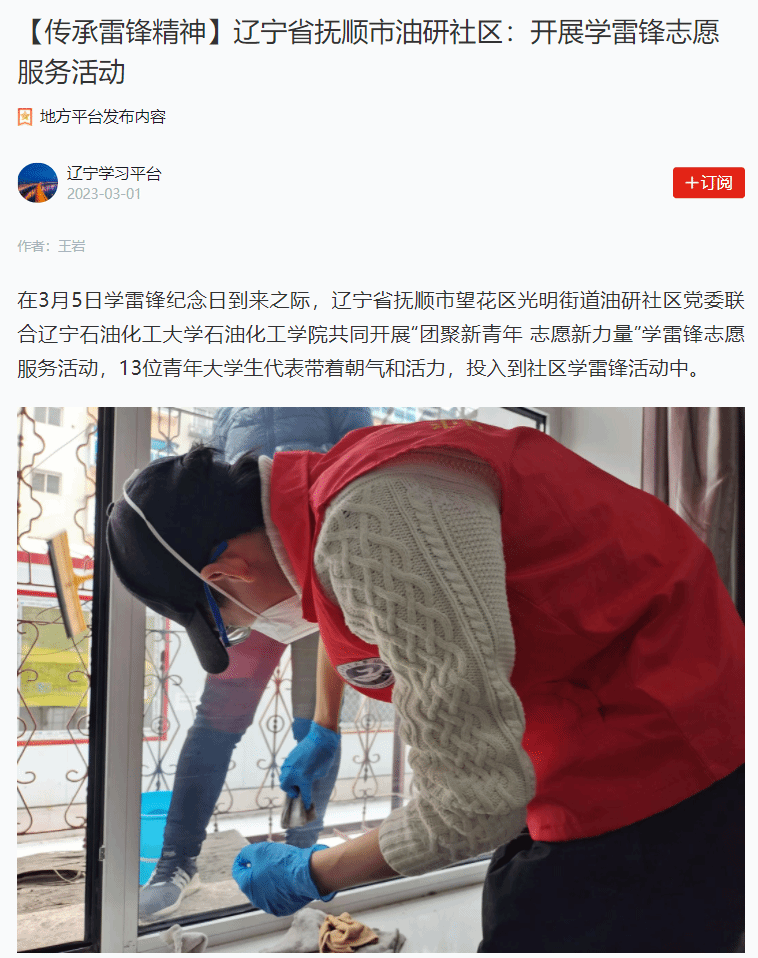 編者按:近日,學習強國遼寧學習平臺對我校石油化工學院與撫順市油研社區共同開展“團聚新青年 志愿新力量”學雷鋒志愿服務活動進行了宣傳報道。現將相關報道轉載如下:
