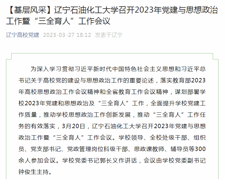 編者按:近日,遼寧高校黨建微信公眾號、遼寧日報·北國號對我校為落實教育部2023年高校思想政治工作會議精神和全省教育工作會議精神,謀劃部署學校2023年黨建和思想政治及“三全育人”工作,全面提升學校黨建工作質量,推動學校思想政治工作創新發展,推動“三全育人”工作任務的有效落實,召開2023年黨建與思想政治工作暨“三全育人”工作會議進行了宣傳報道?,F將相關報道轉載如下: