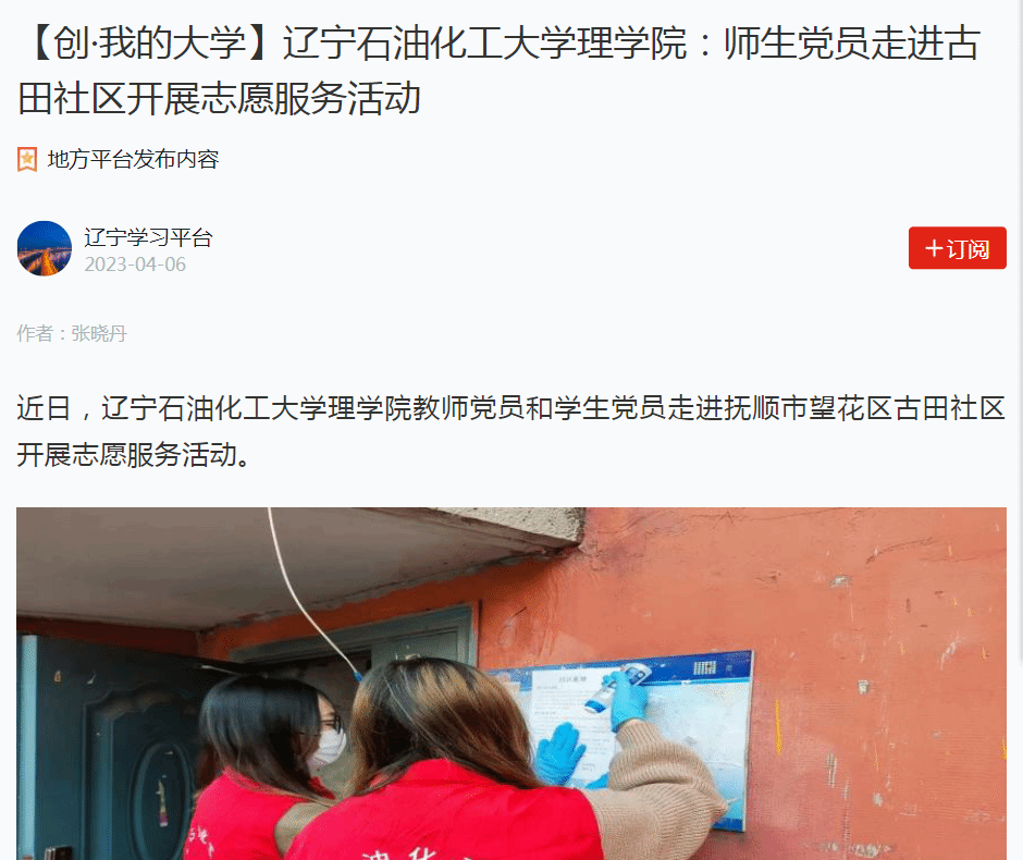 編者按:近日,學習強國遼寧學習平臺對我校理學院教師黨員和學生黨員走進撫順市望花區古田社區開展志愿服務活動進行了宣傳報道?,F將相關報道轉載如下: