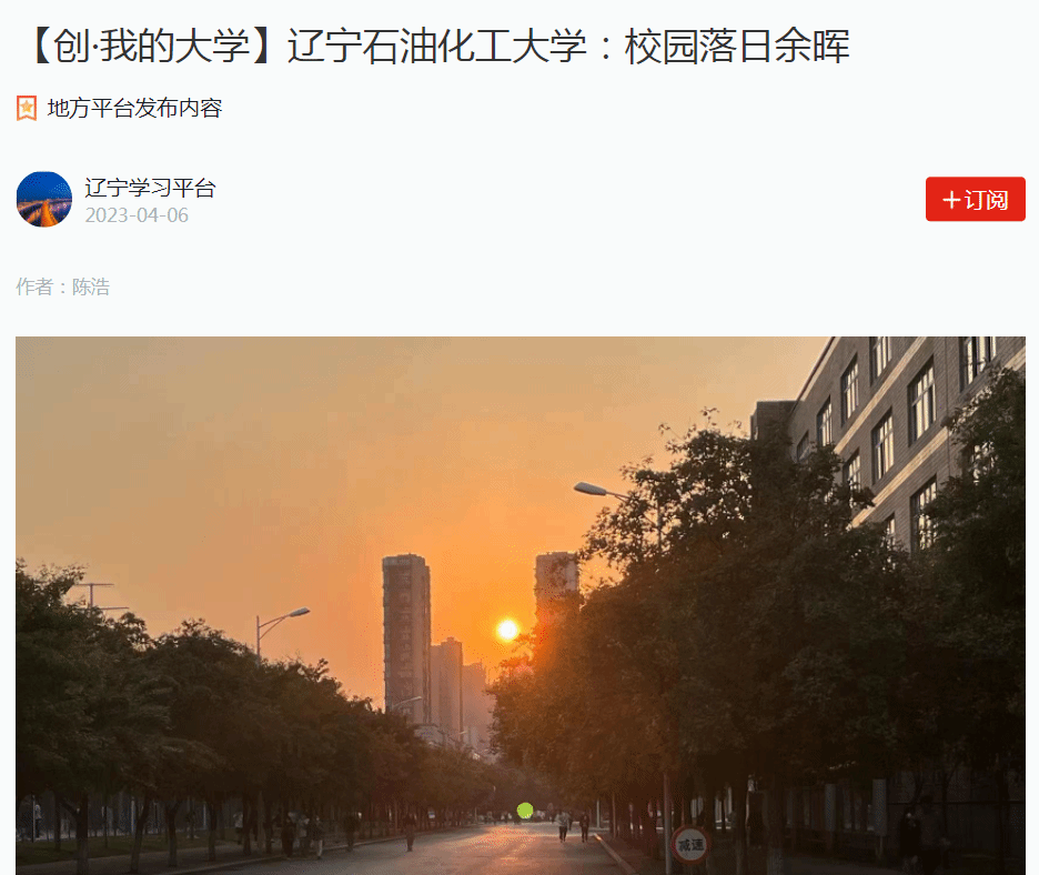 編者按:近日,學習強國遼寧學習平臺對我校宣傳部選送的新媒體工作室陳浩同學拍攝的校園美景落日余暉圖集進行了宣傳報道?,F將相關報道轉載如下: