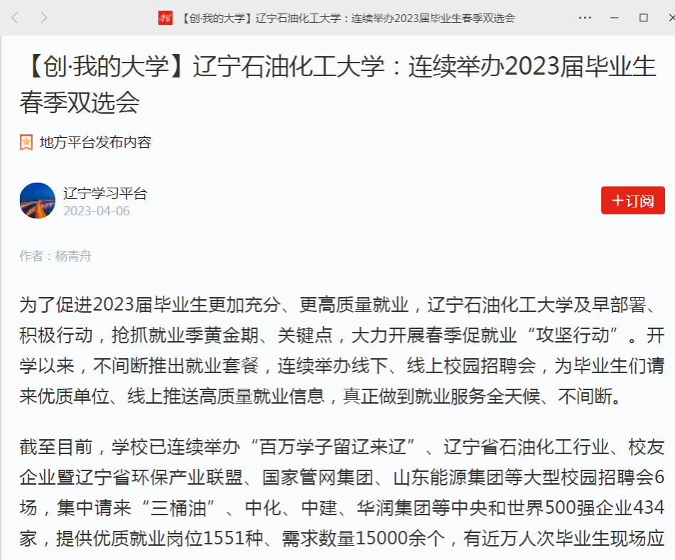 編者按:近日,學習強國遼寧學習平臺、人民日報客戶端·人民號、遼寧日報·北國號等媒體平臺對我校連續舉辦2023屆畢業生春季雙選會進行了宣傳報道?,F將相關報道轉載如下: