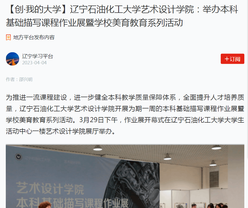 編者按:近日,學習強國遼寧學習平臺、人民日報客戶端·人民號、遼寧日報·北國號等媒體平臺對我校藝術設計學院為推進一流課程建設,進一步健全本科教學質量保障體系,全面提升人才培養質量,開展為期一周的本科基礎描寫課程作業展暨學校美育教育系列活動進行了宣傳報道?,F將相關報道轉載如下: