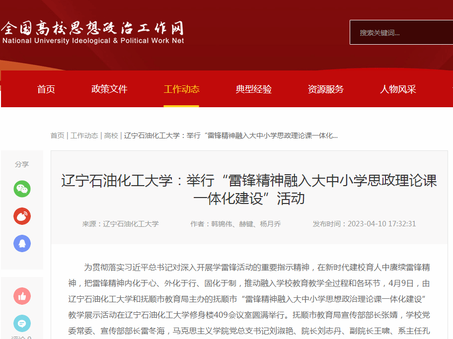 編者按:4月9日,由遼寧石油化工大學和撫順市教育局主辦的撫順市“雷鋒精神融入大中小學思想政治理論課一體化建設”教學展示活動在遼寧石油化工大學修身樓409會議室圓滿舉行。全國高校思想政治工作網、遼寧日報·北國號、人民日報客戶端·人民號等媒體平臺進行了宣傳報道?,F將相關報道轉載如下: