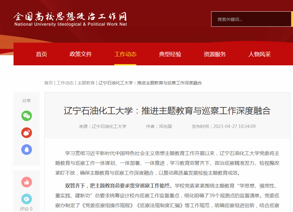 編者按:近日,全國高校思政工作網對我校黨委將主題教育與巡察工作一體謀劃、一體部署、一體推進,學習教育雙管齊下、政治巡察精準發力、檢視整改緊盯不放,確保主題教育與巡察工作深度融合,以推動高質量發展檢驗主題教育成效進行了宣傳報道?,F將相關報道轉載如下: