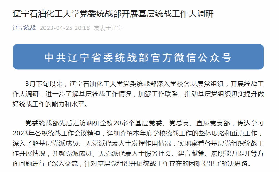 編者按:4月25日,遼寧統戰微信公眾號發布了微文《遼寧石油化工大學黨委統戰部開展基層統戰工作大調研》,對我校黨委統戰部深入學校各基層黨組織,開展統戰工作大調研,進一步了解基層統戰工作情況,加強工作聯系,推動基層黨組織切實提升做好統戰工作的能力和水平進行了宣傳報道?,F將相關報道轉載如下:
