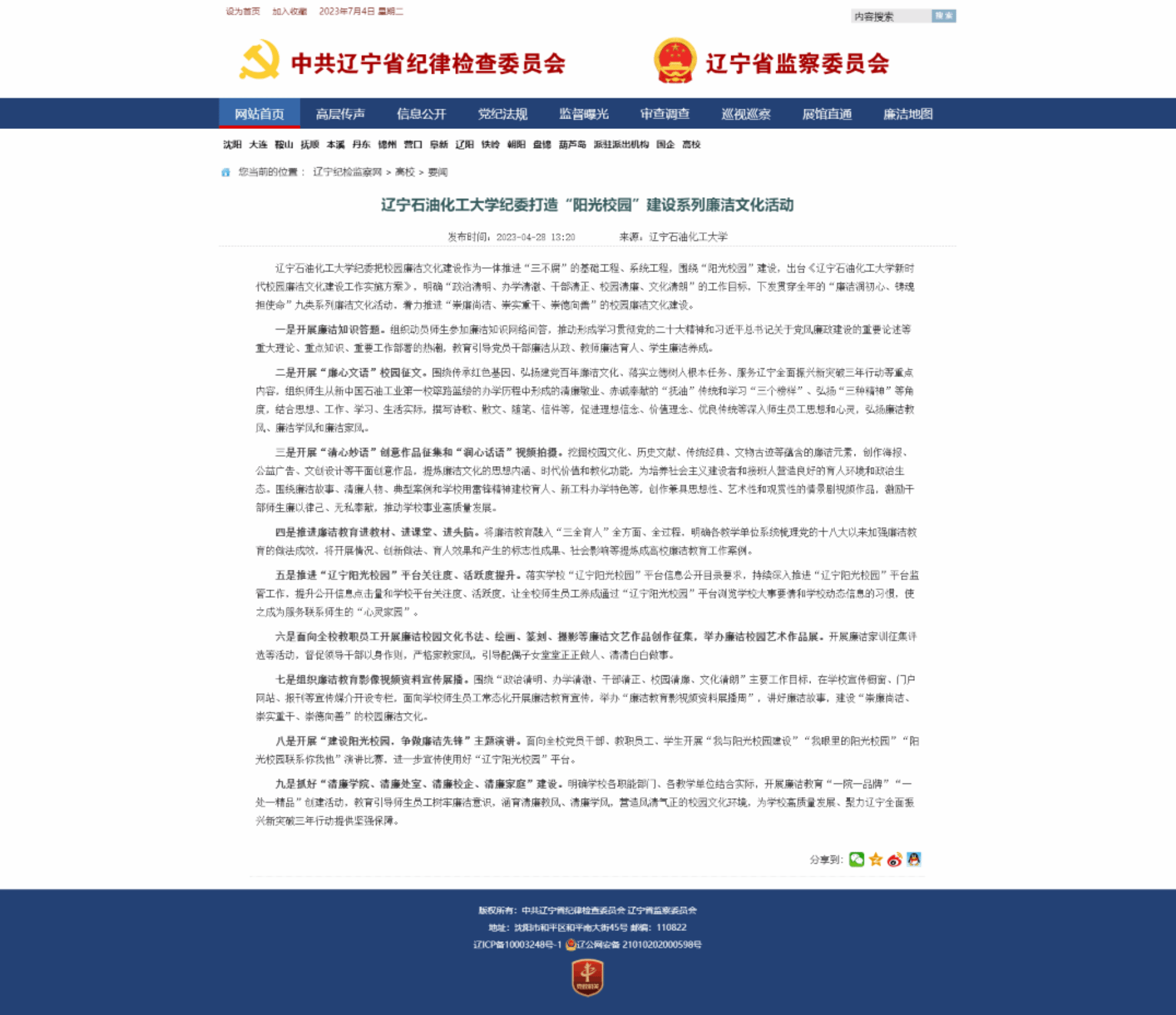編者按:2023年4月28日,遼寧紀檢監察網以《遼寧石油化工大學紀委打造“陽光校園”建設系列廉潔文化活動》為題,對學校圍繞“陽光校園”建設,出臺《遼寧石油化工大學新時代校園廉潔文化建設工作實施方案》,明確“政治清明、辦學清澈、干部清正、校園清廉、文化清朗”的工作目標,陸續開展貫穿全年的“廉潔潤初心、鑄魂擔使命”九類系列廉潔文化活動,著力推進“崇廉尚潔、崇實重干、崇德向善”的校園廉潔文化建設情況進行了宣傳報道。現將相關報道轉載如下: