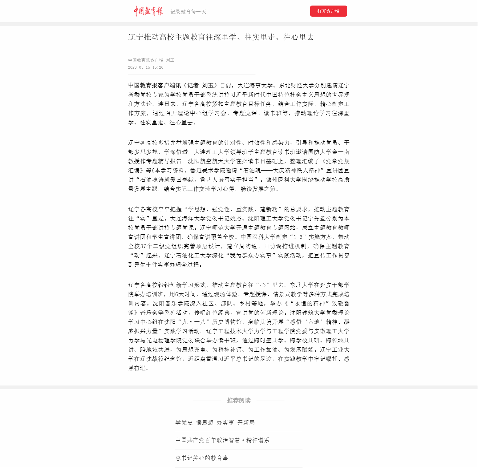 編者按:近日,中國教育報客戶端對遼寧推動高校主題教育往深里學、往實里走、往心里去進行了報道,其中對我校深化“我為群眾辦實事”實踐活動,把宣傳工作貫穿到民生十件實事辦理全過程的特色做法進行了組稿宣傳?,F將相關報道轉載如下: