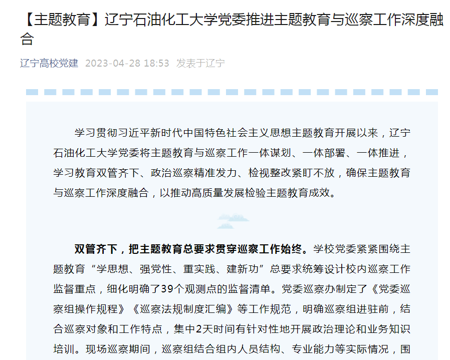 編者按:近日,遼寧高校黨建微信公眾號、網易新聞等媒體平臺對我校黨委將主題教育與巡察工作一體謀劃、一體部署、一體推進,學習教育雙管齊下、政治巡察精準發力、檢視整改緊盯不放,確保主題教育與巡察工作深度融合,以推動高質量發展檢驗主題教育成效進行了宣傳報道?,F將相關報道轉載如下: