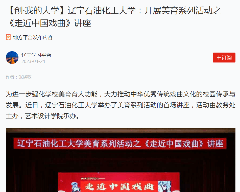 編者按:近日,學習強國遼寧學習平臺、遼寧日報·北國號、人民日報客戶端·人民號等媒體平臺對我校為進一步強化學校美育育人功能,大力推動中華優秀傳統戲曲文化的校園傳承與發展,舉辦了美育系列活動的首場講座進行了宣傳報道?,F將相關報道轉載如下: