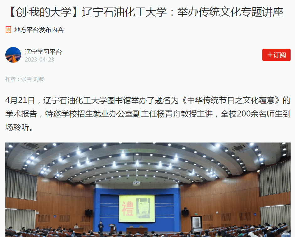 編者按:近日,學習強國遼寧學習平臺、遼寧日報·北國號、人民日報客戶端·人民號等媒體平臺對我校圖書館舉辦了題名為《中華傳統節日之文化蘊意》的學術報告,特邀學校招生就業辦公室副主任楊青舟教授主講,全校200余名師生到場聆聽進行了宣傳報道?,F將相關報道轉載如下: