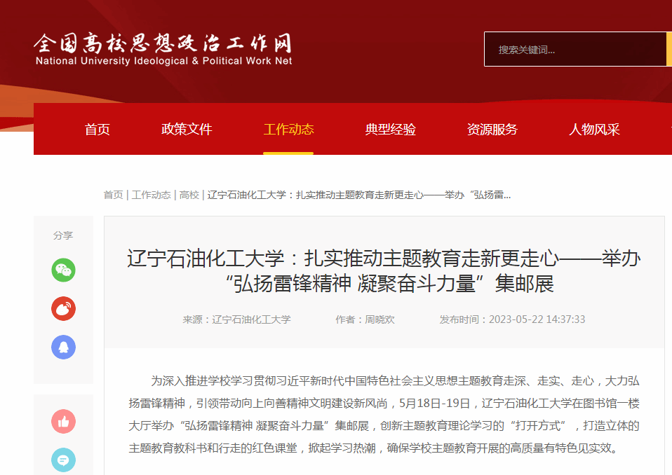編者按:近日,全國高校思想政治工作網、撫順電視臺、遼寧日報·北國號等媒體平臺對我校在圖書館一樓大廳舉辦“弘揚雷鋒精神 凝聚奮斗力量”集郵展,創新主題教育理論學習的“打開方式”,打造立體的主題教育教科書和行走的紅色課堂,掀起學習熱潮,確保學校主題教育開展的高質量有特色見實效進行了宣傳報道?,F將相關報道轉載如下: