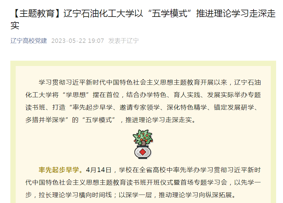 編者按:近日,全國高校思想政治工作網、遼寧高校黨建微信公眾號、遼寧高校思政微信公眾號、遼寧日報·北國號等媒體平臺對我校以“五學模式”推進理論學習走深走實進行了宣傳報道?,F將相關報道轉載如下: