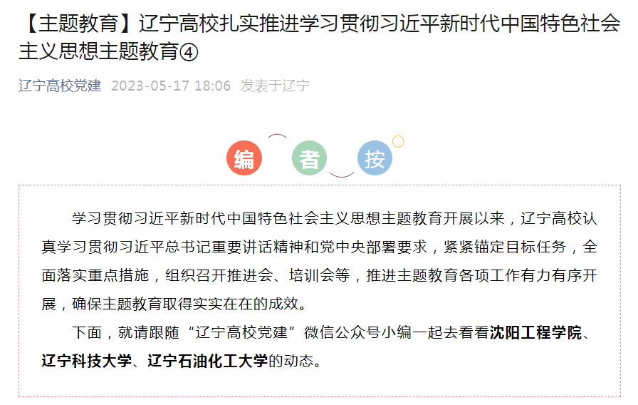 編者按:近日,遼寧高校黨建微信公眾號對遼寧高校認真學習貫徹習近平總書記重要講話精神和黨中央部署要求,緊緊錨定目標任務,全面落實重點措施,組織召開推進會、培訓會等,推進主題教育各項工作有力有序開展,確保主題教育取得實實在在的成效進行了宣傳,其中對我校召開學習貫徹習近平新時代中國特色社會主義思想主題教育領導小組工作會議進行了組稿報道。現將相關報道轉載如下: