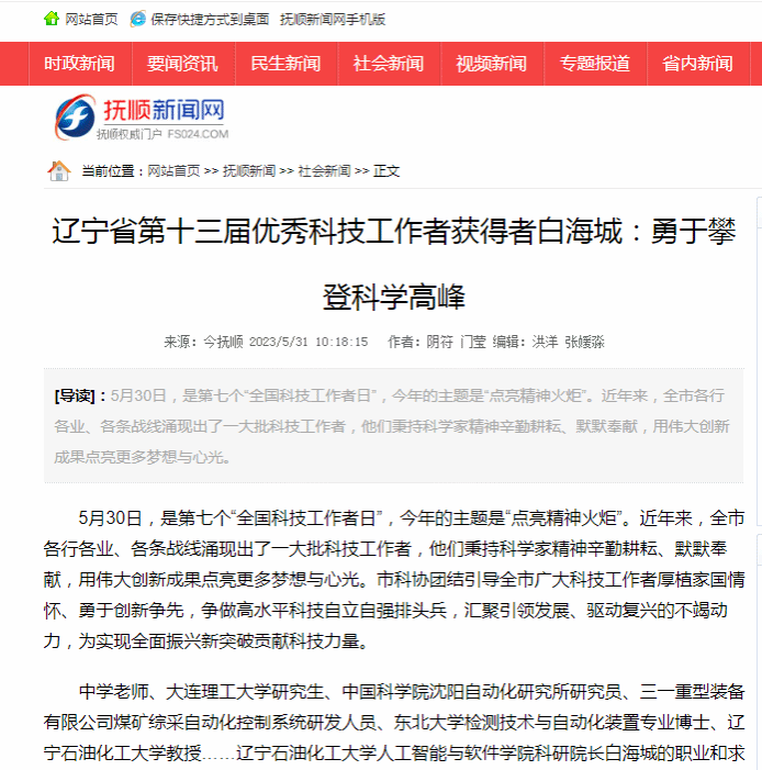 編者按:近日,撫順新聞網對遼寧省第十三屆優秀科技工作者獲得者我校白海城老師勇于攀登科學高峰的典型事跡進行了宣傳報道?,F將相關報道轉載如下: