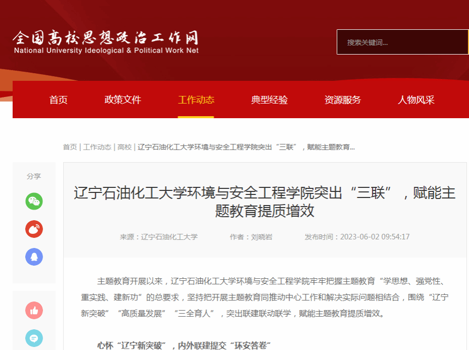 編者按:近日,全國高校思想政治工作網對我校環境與安全工程學院牢牢把握主題教育“學思想、強黨性、重實踐、建新功”的總要求,堅持把開展主題教育同推動中心工作和解決實際問題相結合,圍繞“遼寧新突破”“高質量發展”“三全育人”,突出聯建聯動聯學,賦能主題教育提質增效進行了宣傳報道?,F將相關報道轉載如下: