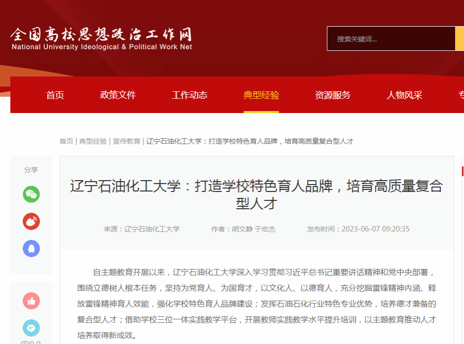 編者按:近日,全國高校思想政治工作網、遼寧日報·北國號等媒體平臺對我校圍繞立德樹人根本任務,堅持為黨育人、為國育才,以文化人、以德育人,充分挖掘雷鋒精神內涵、釋放雷鋒精神育人效能,強化學校特色育人品牌建設;發揮石油石化行業特色專業優勢,培養德才兼備的復合型人才;借助學校三位一體實踐教學平臺,開展教師實踐教學水平提升培訓,以主題教育推動人才培養取得新成效進行了宣傳報道。現將相關報道轉載如下: