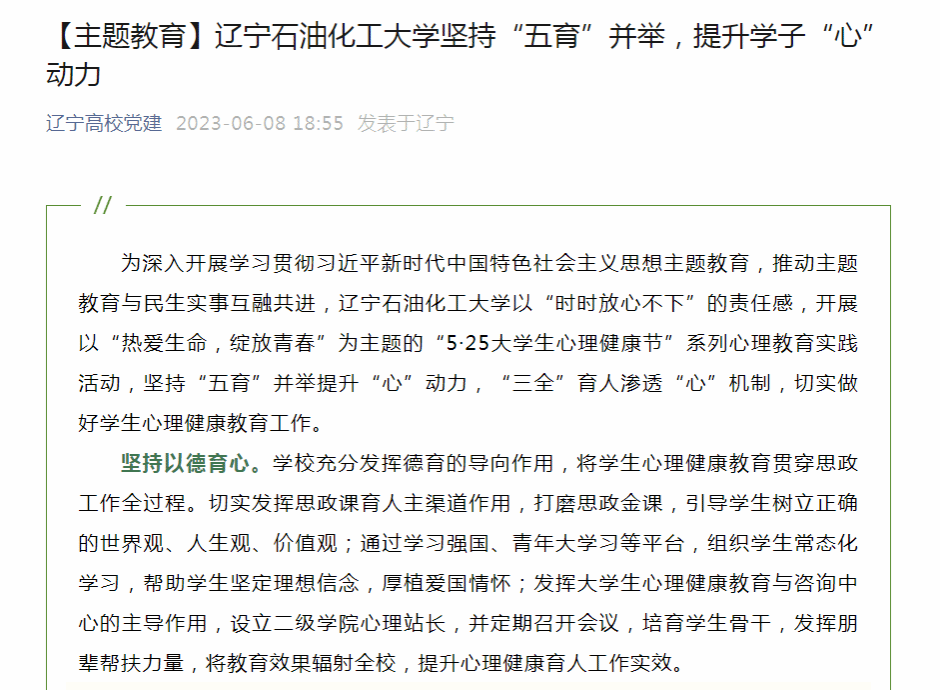 編者按:6月8日,遼寧高校黨建微信公眾號對我校深入開展學習貫徹習近平新時代中國特色社會主義思想主題教育,推動主題教育與民生實事互融共進,開展以“熱愛生命,綻放青春”為主題的“5·25大學生心理健康節”系列心理教育實踐活動,堅持“五育”并舉提升“心”動力,“三全”育人滲透“心”機制,切實做好學生心理健康教育工作進行了宣傳報道?,F將相關報道轉載如下:
