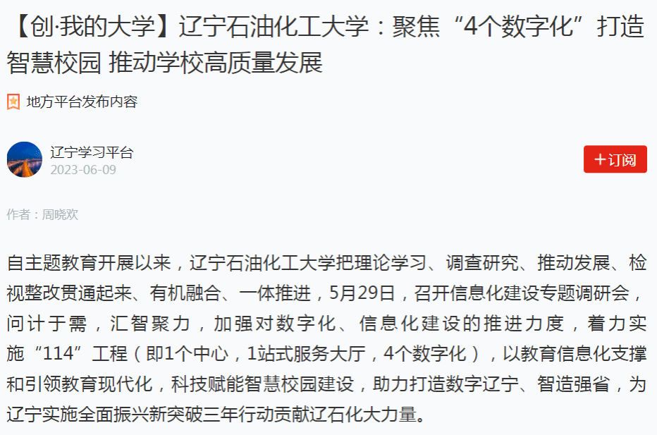 編者按:近日,全國高校思想政治工作網、學習強國遼寧學習平臺、遼寧日報·北國號等媒體平臺對我校把理論學習、調查研究、推動發展、檢視整改貫通起來、有機融合、一體推進,5月29日,召開信息化建設專題調研會,問計于需,匯智聚力,加強對數字化、信息化建設的推進力度,著力實施“114”工程(即1個中心,1站式服務大廳,4個數字化),以教育信息化支撐和引領教育現代化,科技賦能智慧校園建設,助力打造數字遼寧、智造強省,為遼寧實施全面振興新突破三年行動貢獻遼石化大力量進行了宣傳報道。現將相關報道轉載如下: