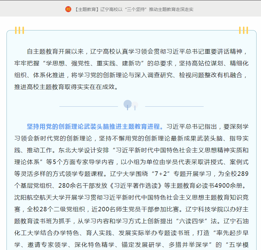 編者按:近日,遼寧高校思政微信公眾號、遼寧高校黨建微信公眾號以《遼寧高校以“三個堅持”推動主題教育走深走實》為題,對遼寧高校堅持高站位謀劃、精細化組織、體系化推進,將學習黨的創新理論與深入調查研究、檢視問題整改有機融合,推進高校主題教育取得實實在在成效進行了宣傳,對我校結合辦學特色、育人實踐、發展實際舉辦專題讀書班,打造“率先起步早學、邀請專家領學、深化特色精學、錨定發展研學、多措并舉深學”的“五學模式”,推進理論學習走深走實進行了組稿報道?,F將相關報道轉載如下: