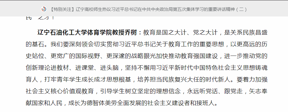 編者按:6月1日,遼寧高校思政微信公眾號以《遼寧高校師生熱議習近平總書記在中共中央政治局第五次集體學習的重要講話精神(二)》為題,組稿刊登了我校體育學院教授喬樹的感悟。現將相關報道轉載如下: