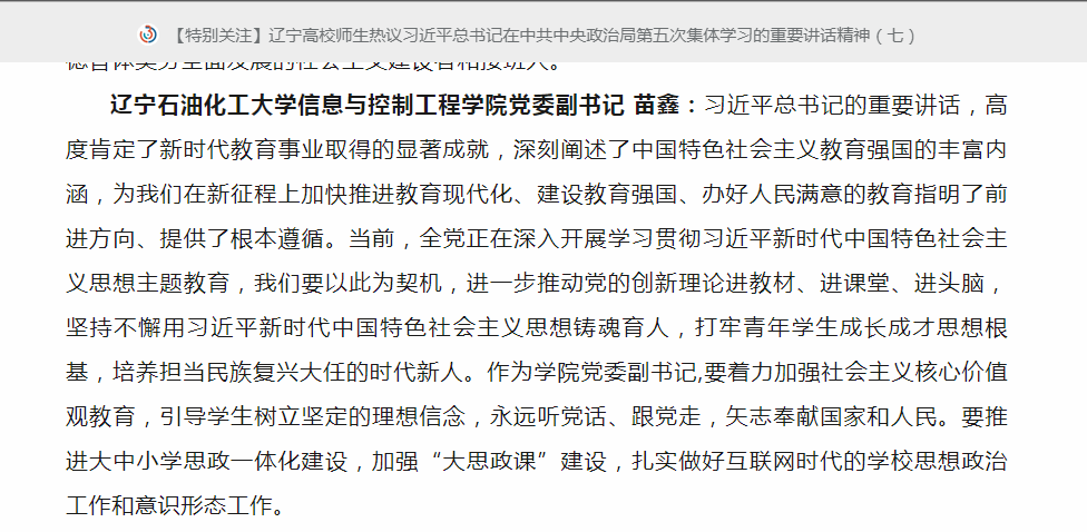 編者按:6月6日,遼寧高校思政微信公眾號以《遼寧高校師生熱議習近平總書記在中共中央政治局第五次集體學習的重要講話精神(七)》為題,組稿刊登了我校信息與控制工程學院黨委副書記苗鑫的感悟?,F將相關報道轉載如下: