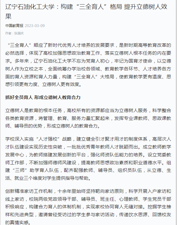 編者按:3月9日,中國教育報、學習強國主平臺對我校張國慶老師撰寫的文章《遼寧石油化工大學:構建“三全育人”格局 提升立德樹人效果》進行了宣傳報道,現將相關報道轉載如下:
