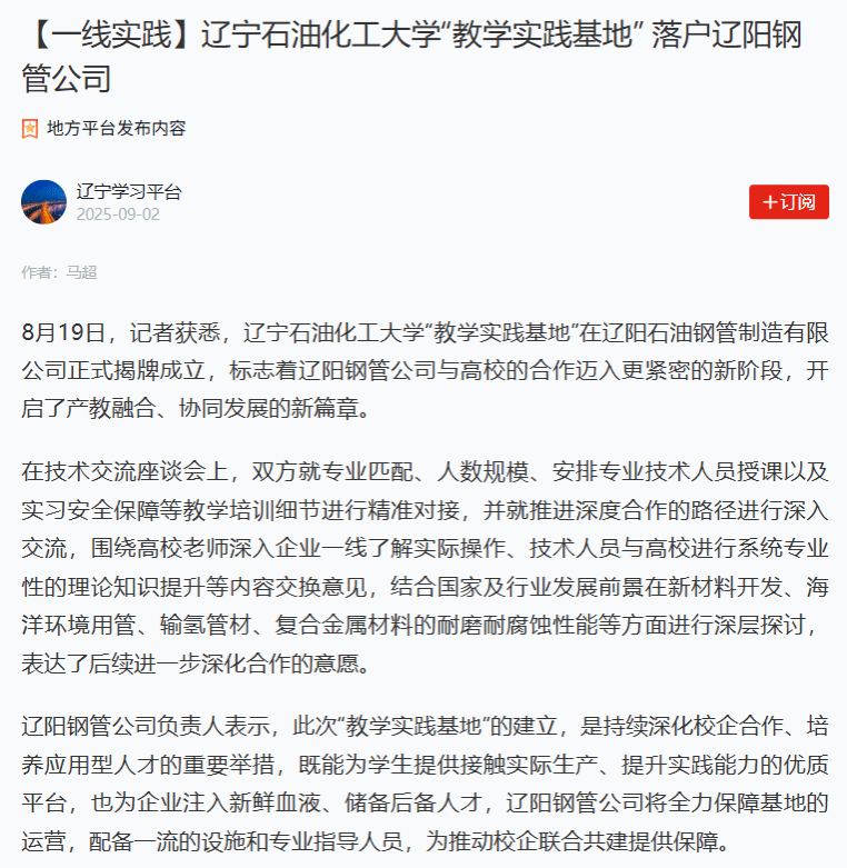編者按:8月19日,遼寧石油化工大學“教學實踐基地”在遼陽石油鋼管制造有限公司正式揭牌成立,標志著遼陽鋼管公司與高校的合作邁入更緊密的新階段,開啟了產教融合、協同發展的新篇章。學習強國遼寧學習平臺對此進行了宣傳報道?,F將相關報道轉載如下: