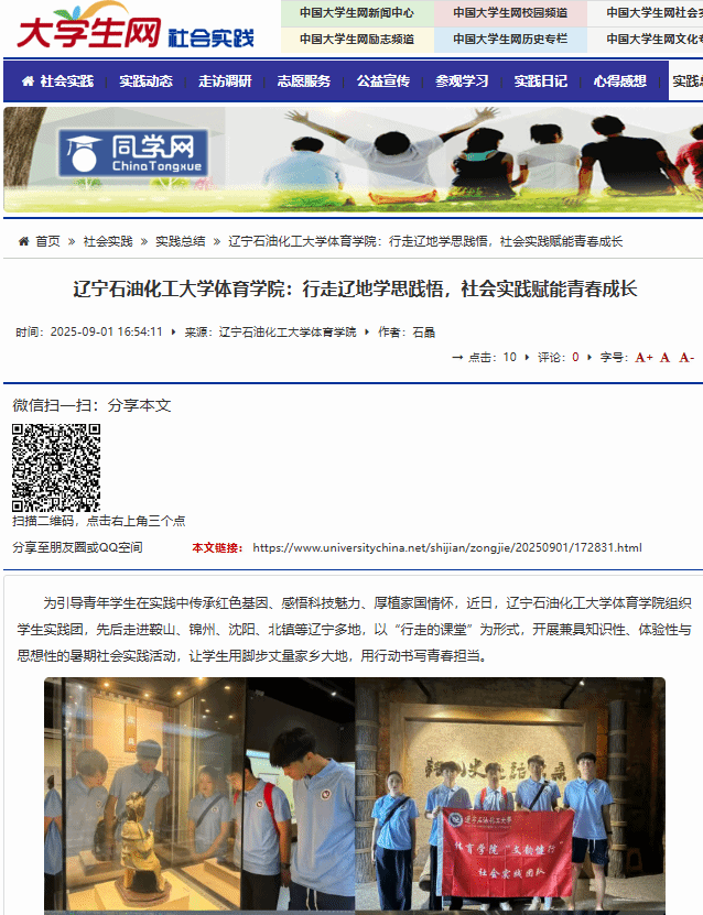 編者按:遼寧石油化工大學體育學院為引導青年學生在實踐中傳承紅色基因、感悟科技魅力、厚植家國情懷,暑期組織學生實踐團,先后走進鞍山、錦州、沈陽、北鎮等遼寧多地,以“行走的課堂”為形式,開展兼具知識性、體驗性與思想性的暑期社會實踐活動,讓學生用腳步丈量家鄉大地,用行動書寫青春擔當。中國大學生網對此進行了宣傳報道?,F將相關報道轉載如下: