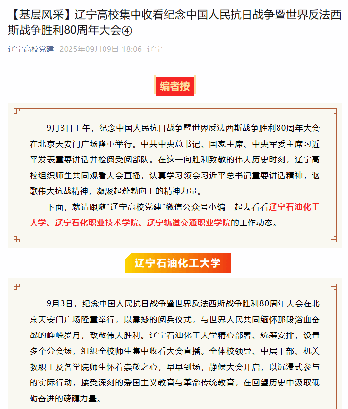 編者按:9月3日上午,紀念中國人民抗日戰爭暨世界反法西斯戰爭勝利80周年大會在北京天安門廣場隆重舉行。遼寧高校組織師生共同觀看大會直播,認真學習領會習近平總書記重要講話精神,謳歌偉大抗戰精神,凝聚起蓬勃向上的精神力量。遼寧高校黨建微信公眾號對我校組織師生觀看情況進行了組稿宣傳?,F將相關報道轉載如下: